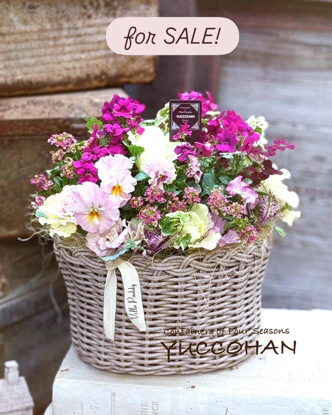 うえたさんの育種パンジー「春マンボー」、育種ビオラ「天の羽衣」を贅沢に使用した、優しいピンク系のギャザリングバスケットです。
